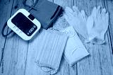 Surgical Mask put beside rubber gloves and blood pressure monitor