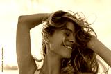 Cheerful pretty girl with closed eyes, long blonde hair, stylish accessories smiling and posing against background of pink sunset sky