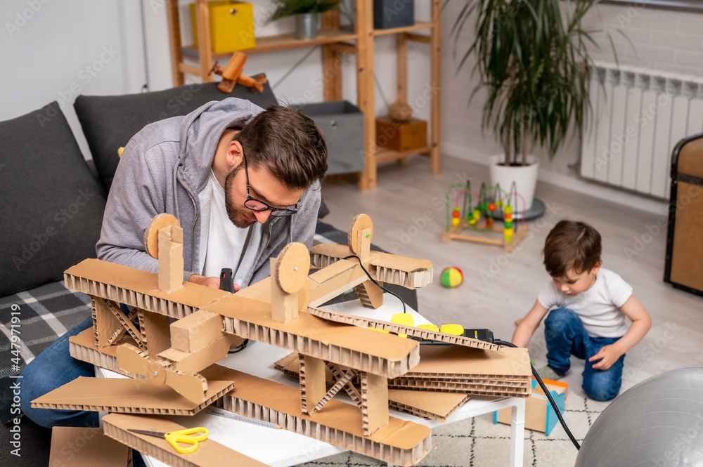 Father making cardboard airplane for his cute young son, while he is playing on a floor