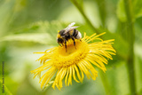 The magnificent elecampane blooms in the forest. A bumblebee sits on a yellow flower and collects nectar or honey. Concept: honey harvest time, medicinal herbs.