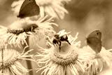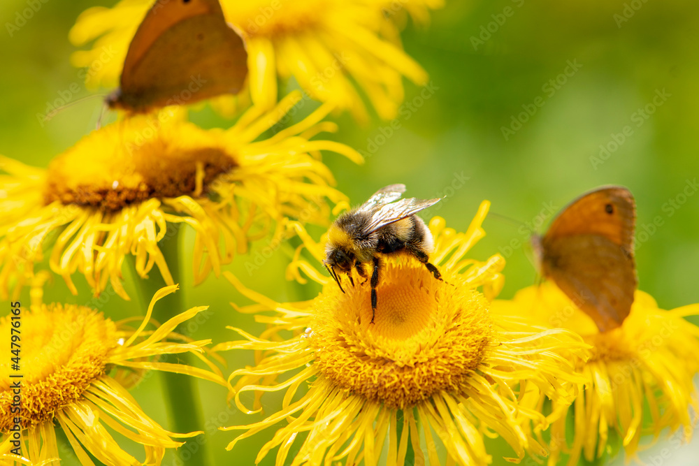The magnificent elecampane blooms in the forest. A bumblebee sits on a yellow flower and collects nectar or honey. Concept: honey harvest time, medicinal herbs.