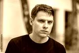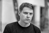 Portrait of a 35-40-year-old man in a black T-shirt on a blurry urban background. Perhaps he is an IT specialist, a specialist in travel, a buyer from a store, a recipient.