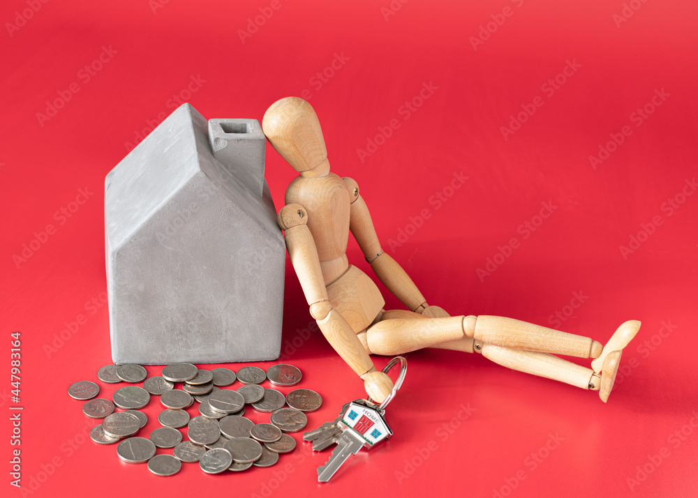 little cement house and house keys with house shape keychain, and wood mannequin and some coins on red background