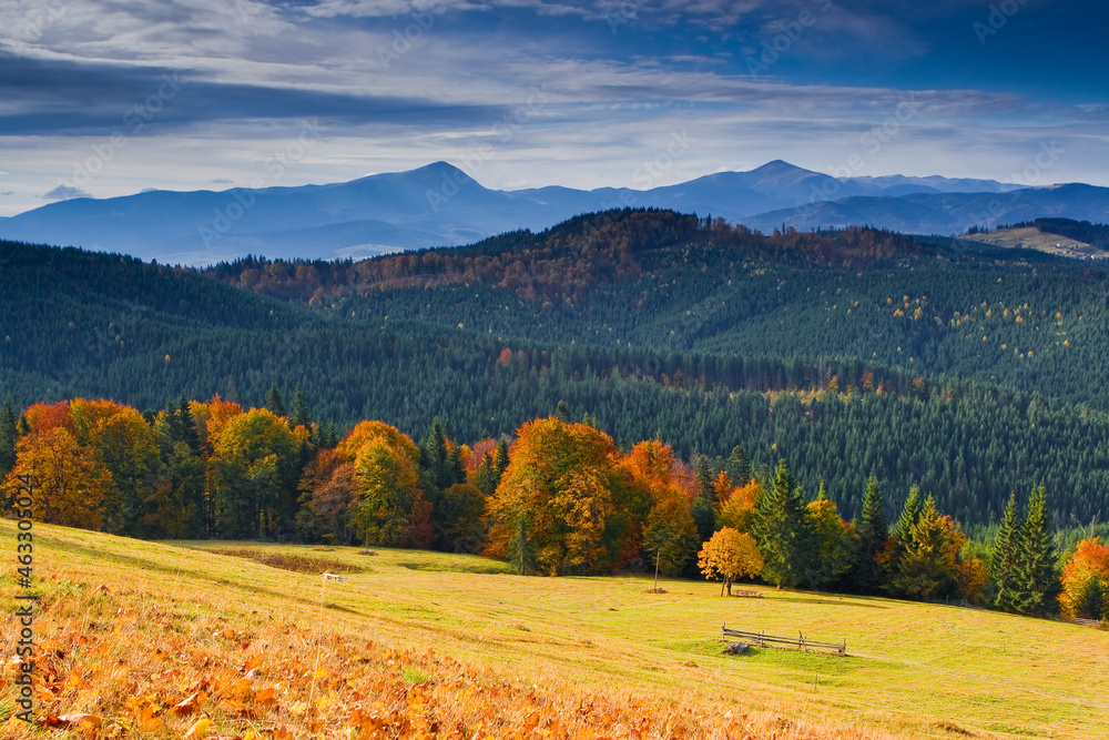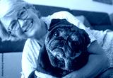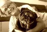 Portrait of black purebred old pug dog sitting with his senior owner on the floor at home. Best friend concept