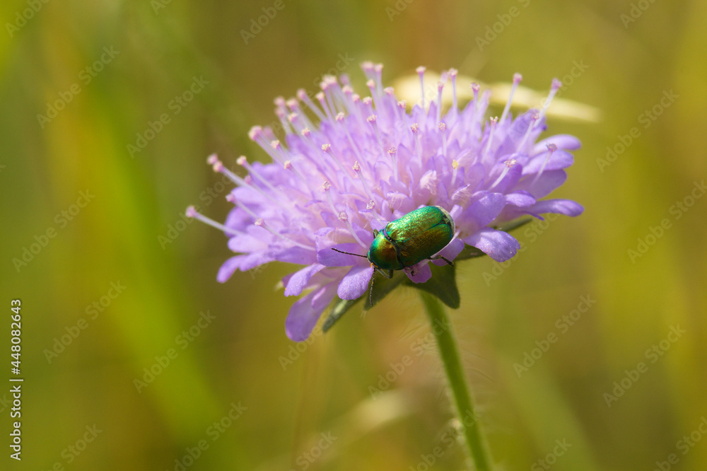 Violet flower with an insect in a meadow on a spring day.