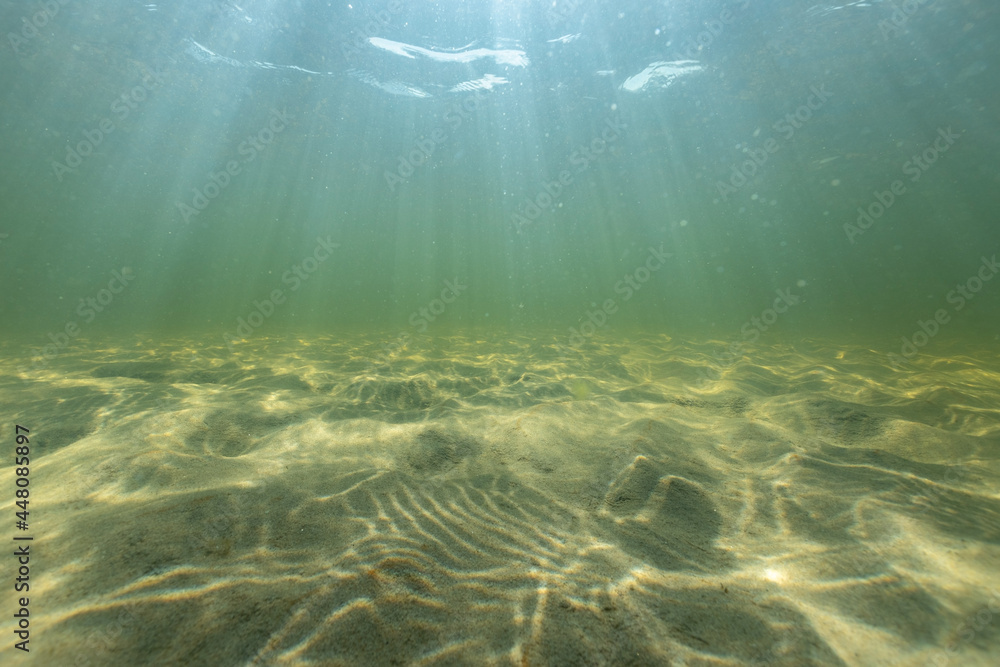 Transparent sea water with sandy bottom and sun underwater rays. Baltic sea.