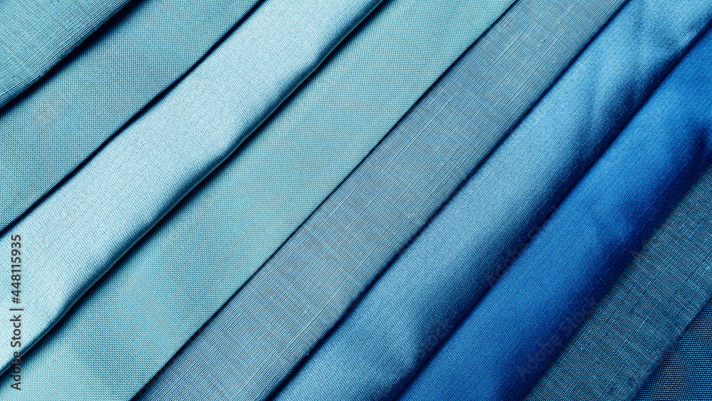 close up multi blue tone of silk fabric samples in catalog. interior drapery or upholstery material palette background for interior concept.