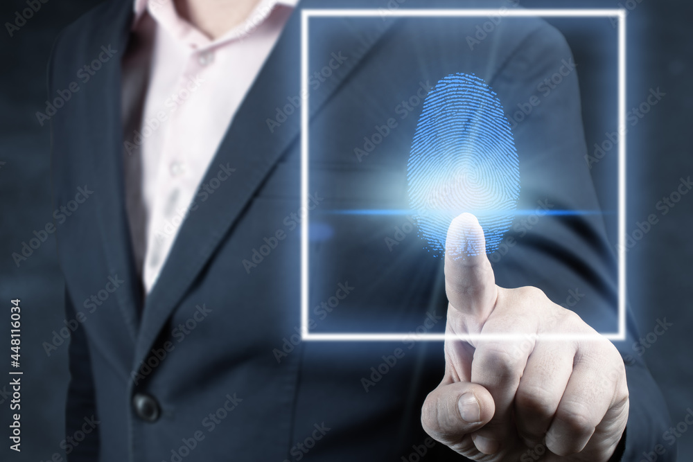 businessman scan fingerprint biometric identity and approval. concept of future of security and password control through fingerprints. Business Technology Safety Internet Network Concept. dark blue