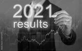 2021 economic results review. businessman writes 2021 results on virtual screen. economic indicators, overcoming the crisis and economic recovery after the coronavirus pandemic in 2021