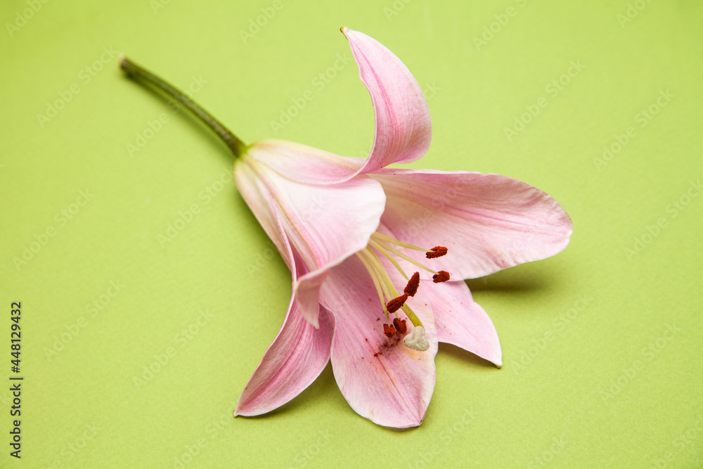 Top view of natural flower of lily plant with delicate pink petals placed on green background