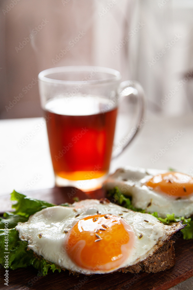 Delicious toasts with fried eggs and lettuce leaves for breakfast placed on table near cup of hot tea in morning