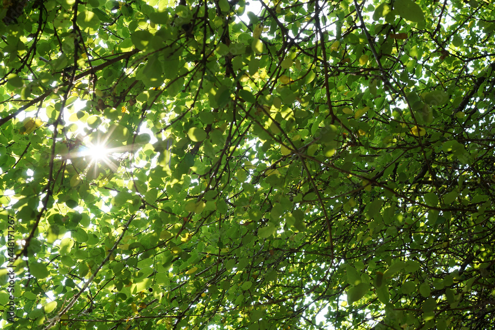 Green natural background with sun flare among the leaves