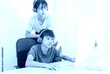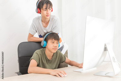 Two multiethnic teenage boys with headphone have fun with computer games at home.