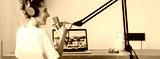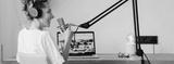 Cheerful woman podcaster recording her voice into microphone. Female radio host streaming podcast using microphone and laptop at his home studio