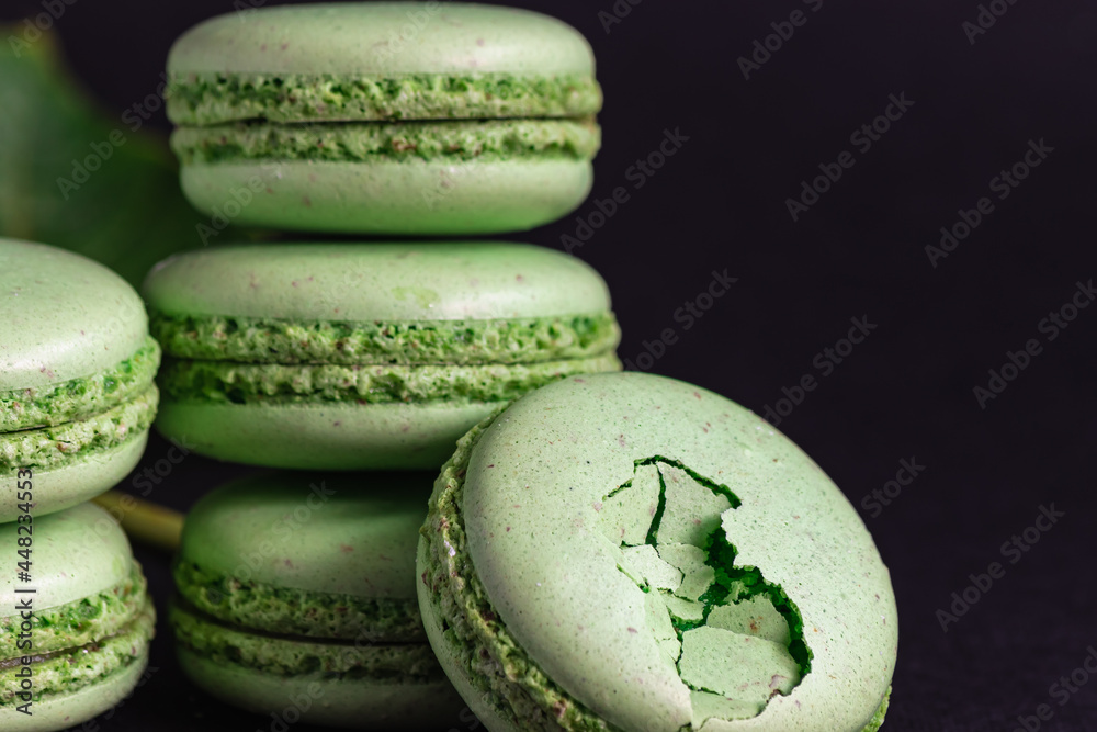 green macaron cakes on a black background