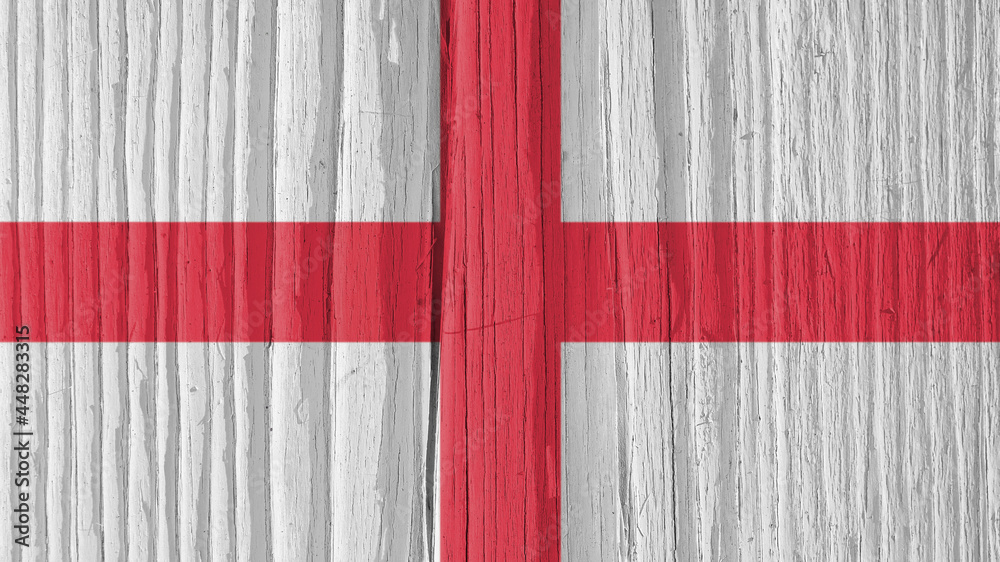 The flag of England on a dry wooden surface, cracked with age. It seems to flutter in the wind. Background, wallpaper or backdrop with national symbol. Saint George's Cross. Hard sunlight with shadows