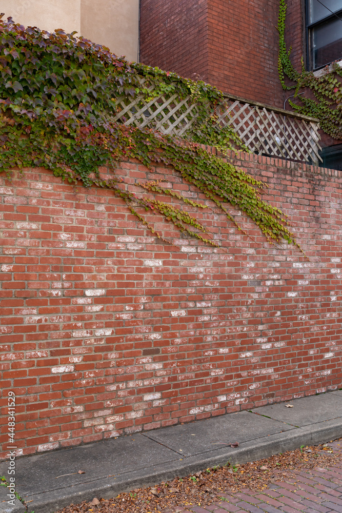 Tall variegated brick wall topped with ivy and lattice running alongside a narrow sidewalk and red brick street, vertical aspect