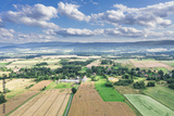 Przedgórze Sudeckie. Pofałdowany teren pokryty polami uprawnymi i lasami. Zdjęcie wykonane z użyciem latającego drona.
