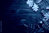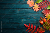 Colorful autumn leaves flat lay. On a blue wooden background. Top view. Free space for your text.