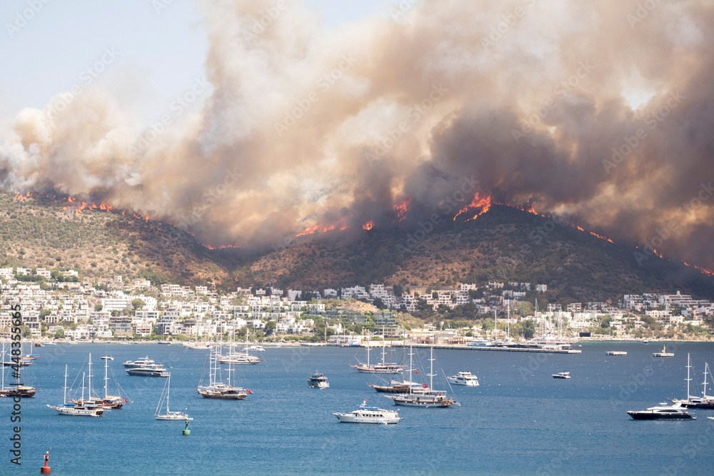 Breaking news: Flames and smoke from wildfires cover the landscape. Clouds of smoke from bush fire blew into the harbor of Bodrum, making it look like an apocalyptic landscape. Escaping to the sea