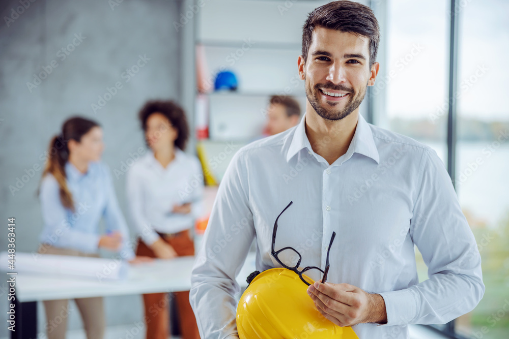 Smiling male architect holding helmet and eyeglasses while looking at camera. There are his colleagues in office working in background.