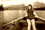 Teenage girl rowing boat on Strbske pleso (Strba tarn) in High Tatra mountains, Slovakia. Scenic landscape in background. Summer holiday concept