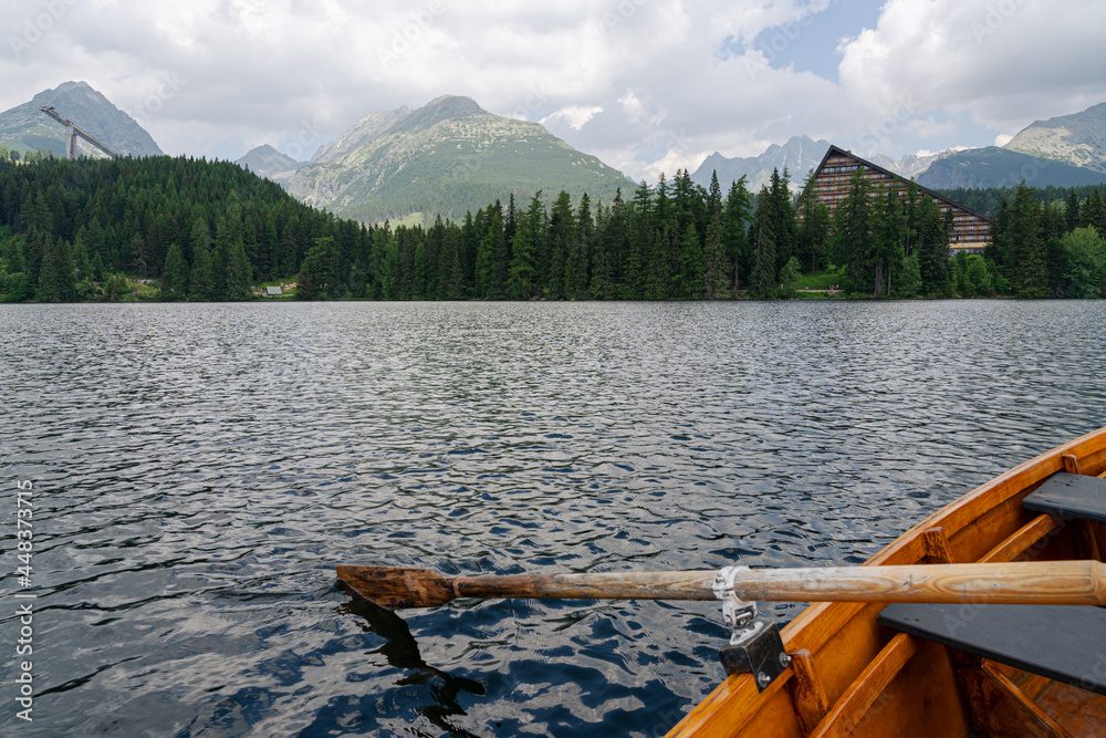 Scenic view from a rowing boat on Strbske pleso (Strba tarn) in High Tatra mountains, Slovakia. Scenic landscape in background. Summer holiday concept