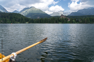 Scenic view from a rowing boat on Strbske pleso (Strba tarn) in High Tatra mountains, Slovakia. Scenic landscape in background. Summer holiday concept