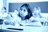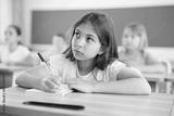 Portrait of cute intelligent schoolgirl who writing exercises at lesson in primary school