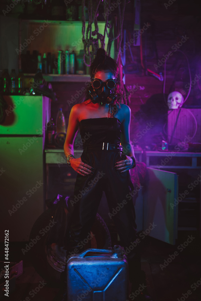 girl soldier in cyberpunk style with a gas mask and glasses with neon lighting in the garage. Steampunk style