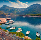 Wonderful summer view of Logari port with small fishing boat and Kyparissi village on background. Spectacular outdoor scene of Peloponnese peninsula, Greece. Morning seascape of Myrtoan Sea.