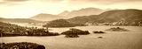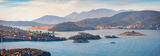 Panoranic summer cityscape of Poros town. Aerial morning seascape of Mediterranean sea with a lots of islands. Colorful outdoor scene of Peloponnese peninsula, Greece. Traveling concept background..