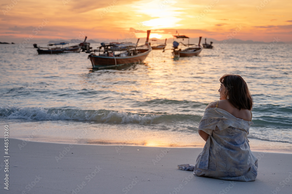 Asian woman tourist sitting on the beach during sunset at Lipe island, Satun, Thailand. Enjoy summer vacation travel.
