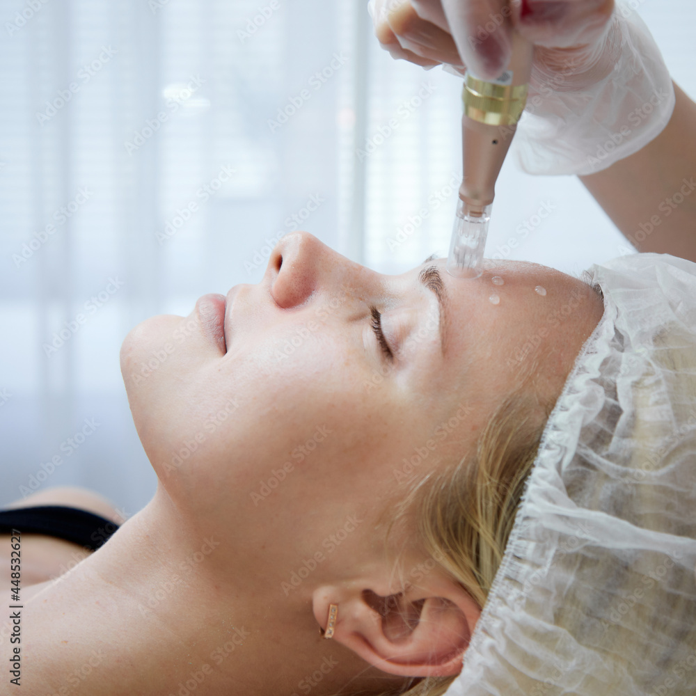 Beautician makes mesotherapy injections. spa beauty treatment, skincare. Woman getting facial care by beautician at spa salon, side view. Wellness center. Healthcare occupation