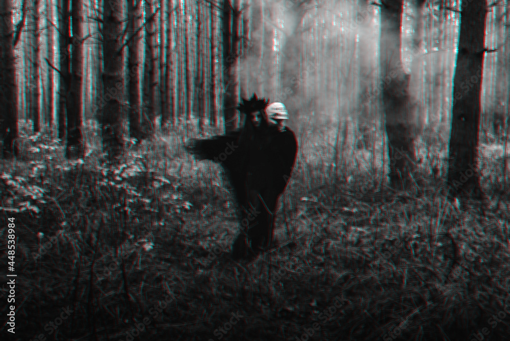 blurry silhouette of an evil black witch with a skull in her hands performing an occult satanic ritual