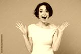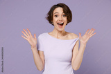 Young excited surprised amazed happy impressed woman 20s with bob haircut wear white t-shirt looking camera spread hands isolated on pastel purple background studio portrait. People lifestyle concept