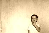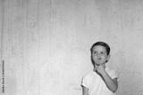 Pensive little guy stands on the wall background. Portrait of wistful boy in white T-shirt, copy space. Concept of reflections and looking for new idea.