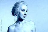 Senior female with flawless skin and bare shoulders, portrait on blue with copy space. Gray haired mature lady posing in studio. Maturity and beauty concept. Advertising for cosmetology and spa