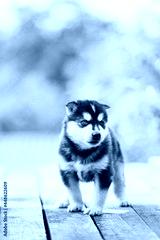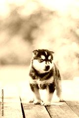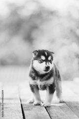 Four-week-old Husky Puppy Of White-gray-black Color Walking On Wooden Ground