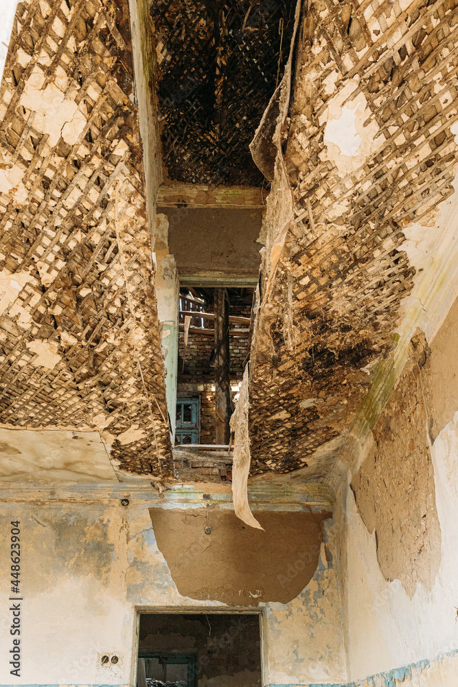 Abandoned Ruined Old Village School Building In Chernobyl Resettlement Zone. Belarus. Chornobyl Catastrophe Disasters. Dilapidated House In Belarusian Village. Whole Villages Must Be Disposed