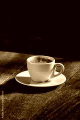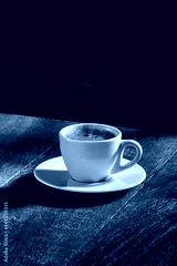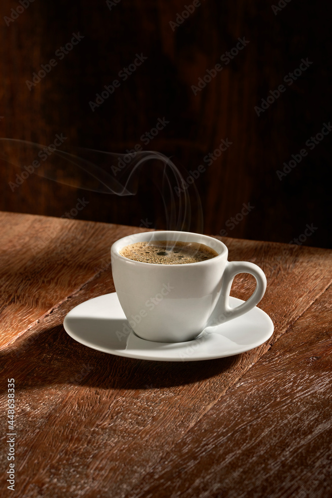 Xícara de café isolado em fundo de madeira rústica, na vertical.