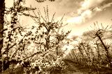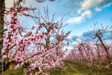 Orchard of peach trees bloomed in spring.Aerial shot with drone