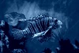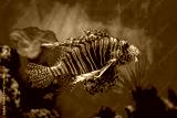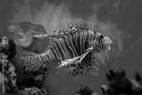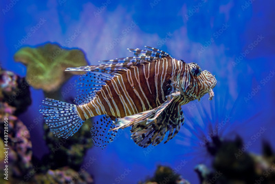 Red Lionfish - Pterois volitans or zebrafish is a venomous coral reef fish in the family Scorpaenidae. Close-up a striped predatory fish in a blue backlit fish tank