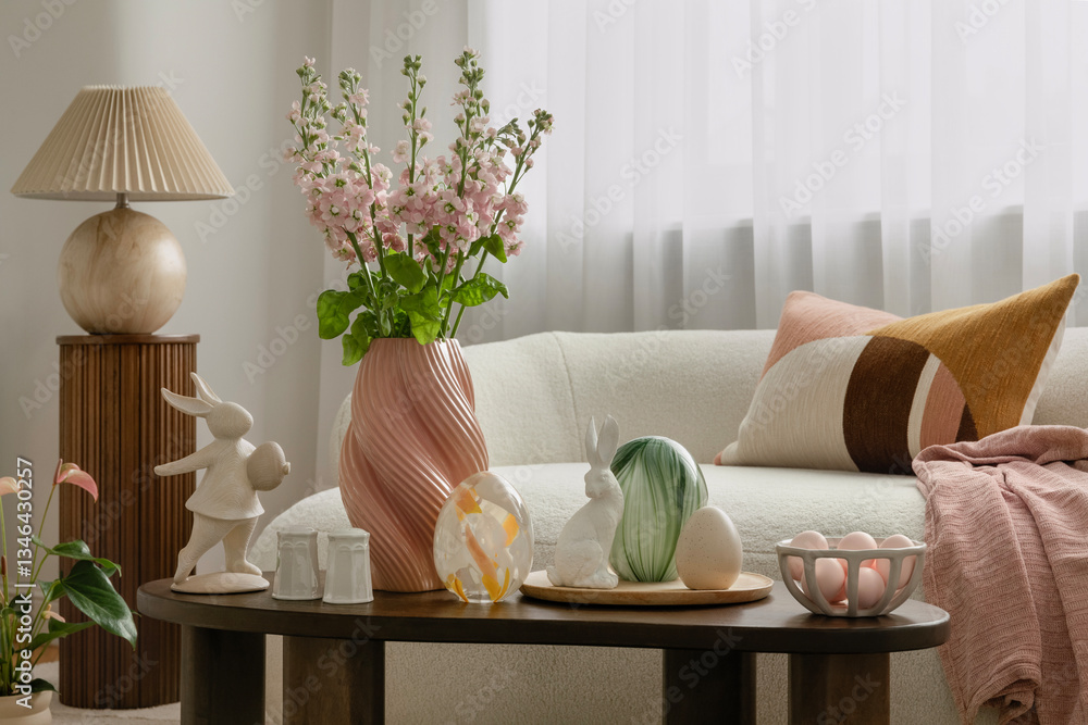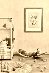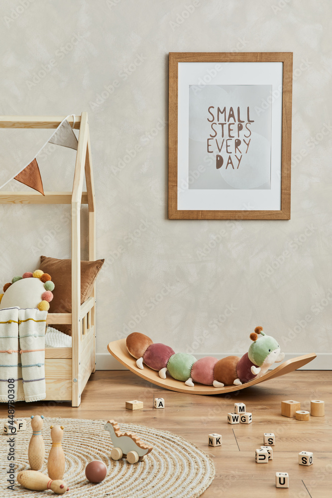 Stylish composition of cozy scandi child's room interior with mock up poster frame, bed, plush caterpillar on balance board, toys and hanging decorations. Creative wall, carpet on the floor. Template.