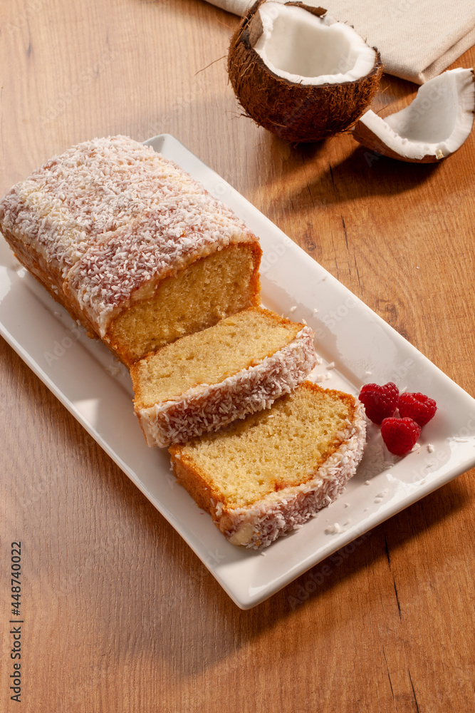 Bizcocho casero de coco sobre mesa de madera. Homemade coconut cake on wooden table.