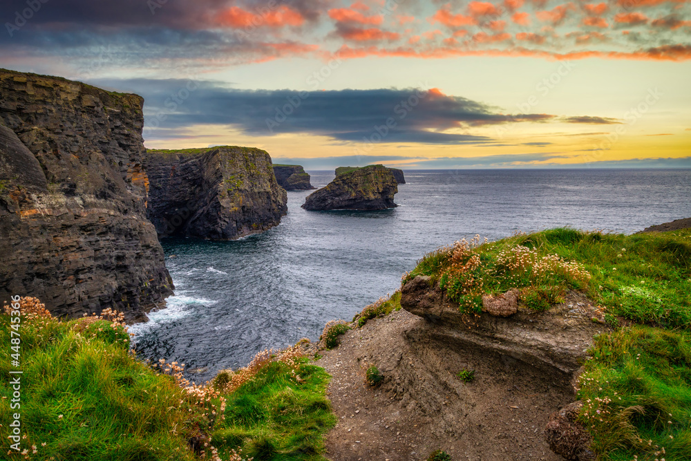 Rocky cliffs in Kilkee at sunset, County Clare. Ireland.