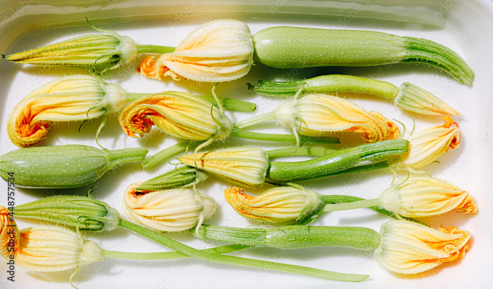 zucchini flowers in varying degrees of disclosure, ready to cook