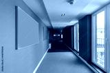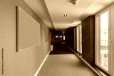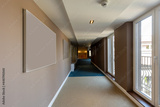 Interior of a long corridor with mock up for paintings, blank frame, brown walls