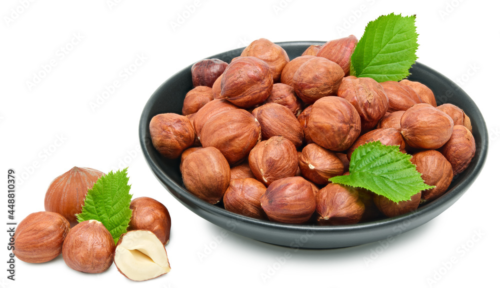 hazelnuts in black bowl isolated on white background macro. clipping path