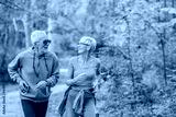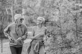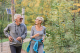 Smiling senior couple jogging in the park. Sports activities for elderly people.